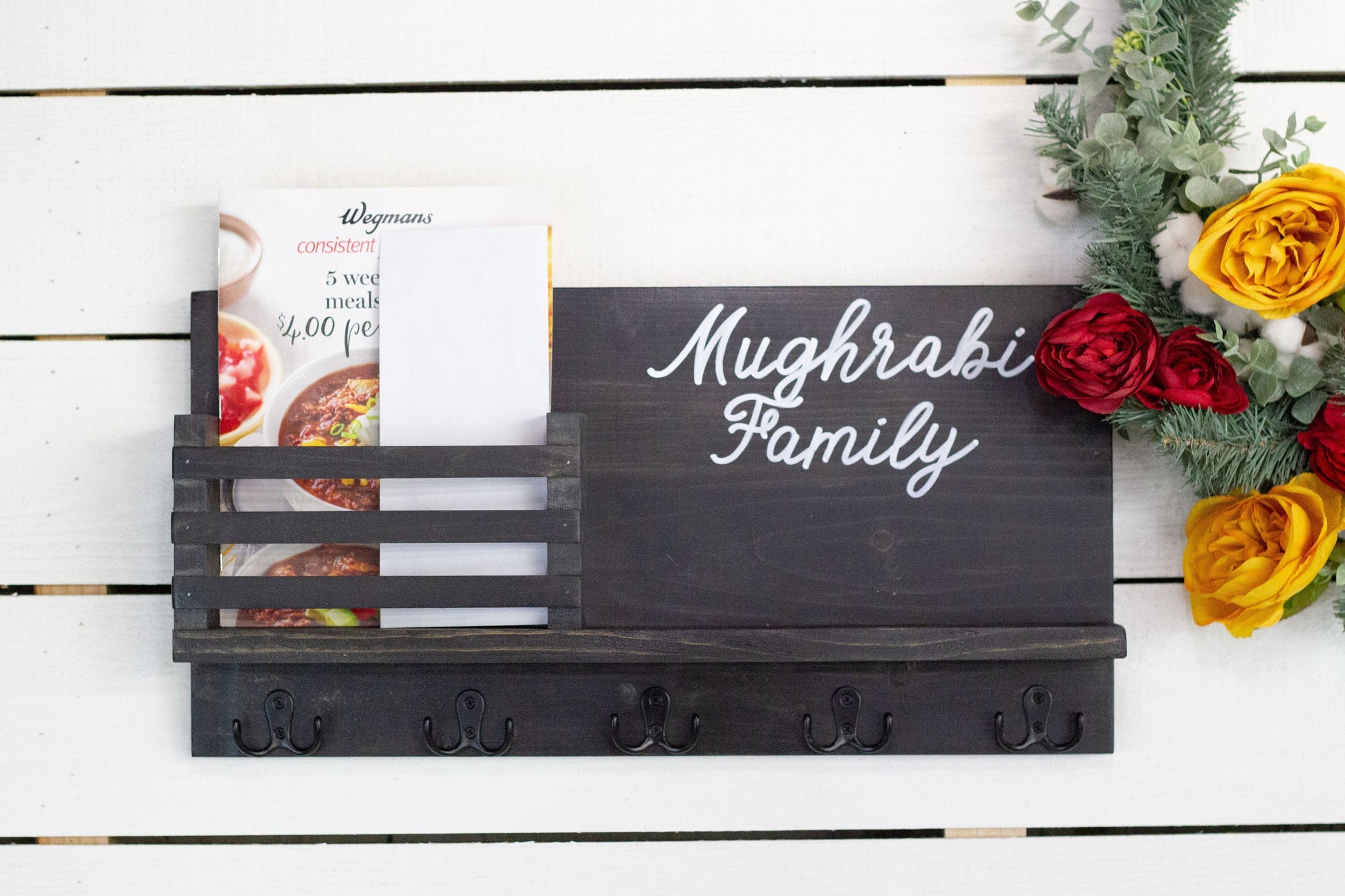PLEASE NOTE- Hand crafted in NY with new pine. Each piece is custom made from new wood. Wood grain variations and/or knots are to be expected and will vary from the picture shown. Due to the character of wood, sometimes knots or imperfections are present. We feel that slight imperfections help add to the character of our handmade items. Back is unpainted/unstained. *This listing is for an empty mail sorter. Mail sorter does not include letters, flowers, jar or keys* The variations in wood products include, but are not limited to... wood grain pattern, color variations, hairline cracks, small dents or scratches, knots, and/or mineral streaks.